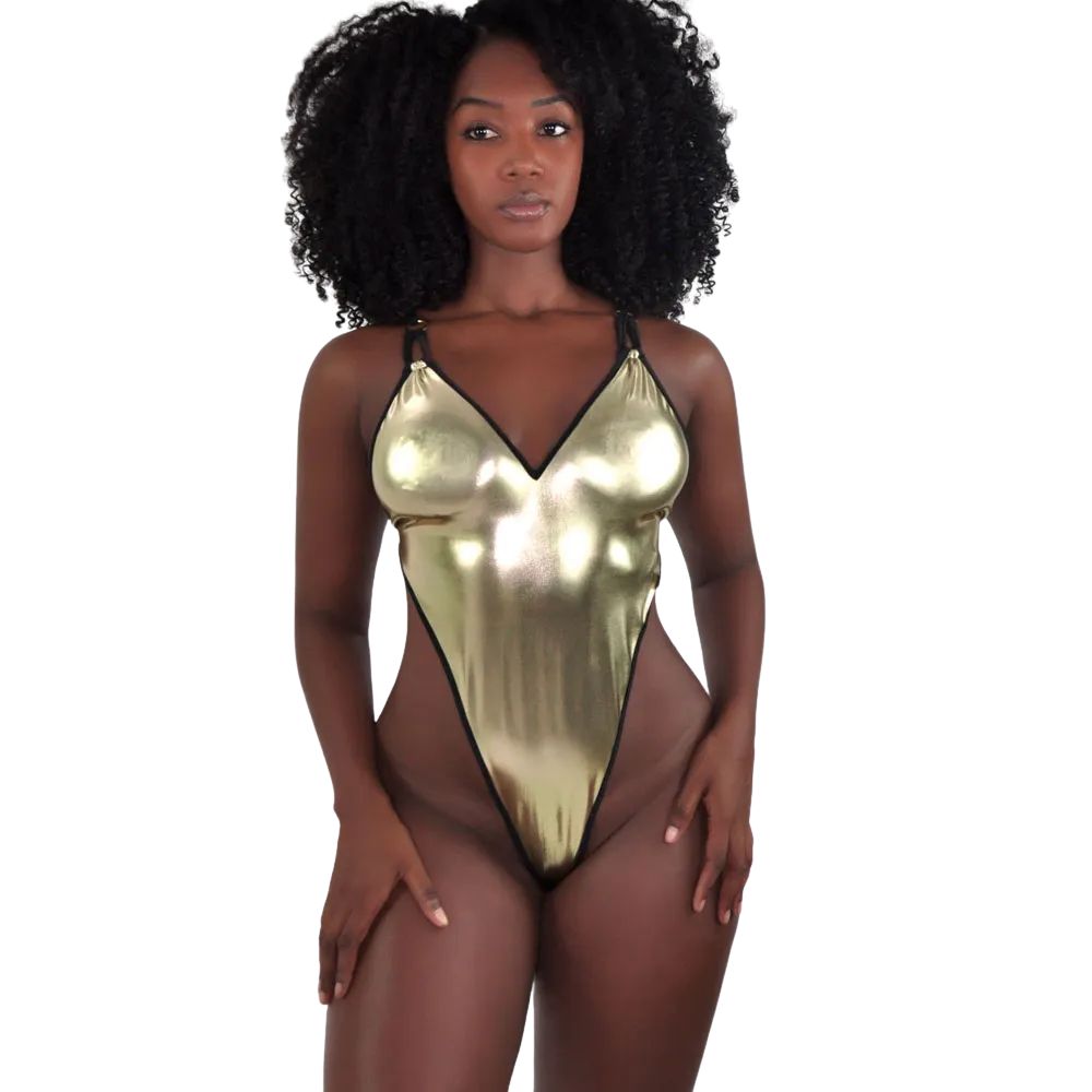 Confeccionado em lycra dourada metalizada, o Body Secura chama atenção pelo seu brilho luxuoso e acabamento impecável. Seu design supercavado e fio dental garante um visual marcante e provocante, enquanto as costas nuas deixam o look ainda mais sensual, garantindo que você seja o centro das atenções.