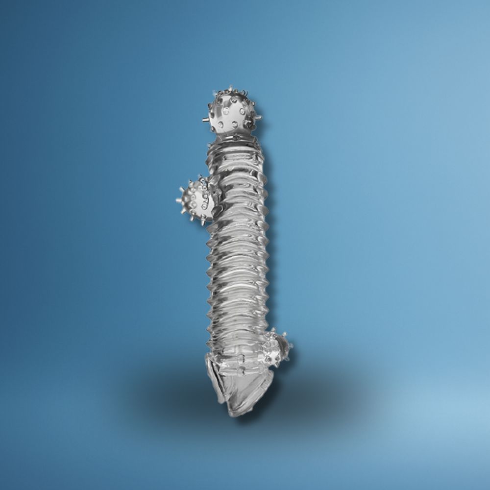 Com uma esfera extensora de 2,5 cm, esta capa permite um ganho imediato de comprimento, enquanto seu corpo texturizado aumenta a circunferência, preenchendo mais e gerando maior satisfação visual e física.