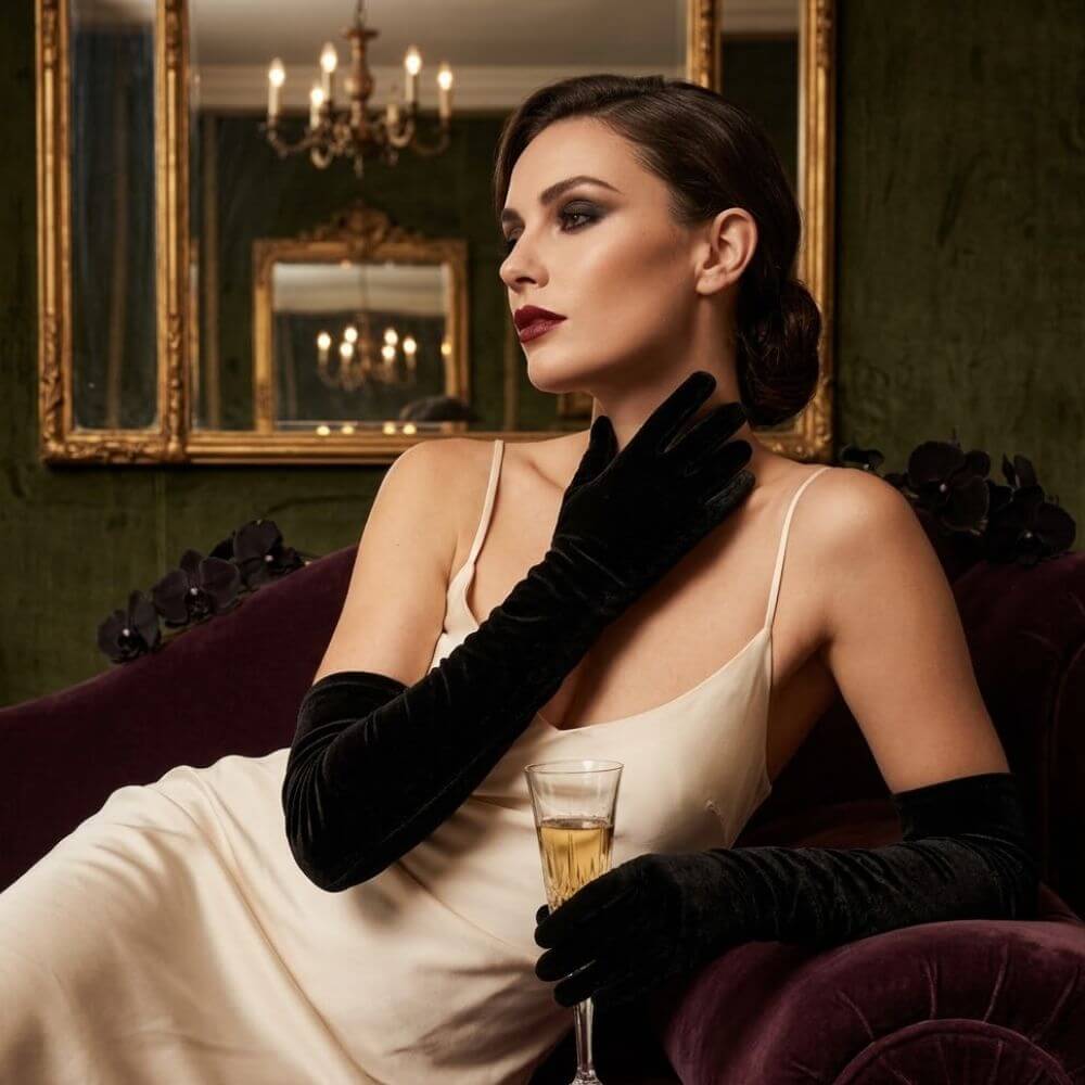 Com design ergonômico que se molda suavemente às mãos e braços, estas luvas valorizam a silhueta, tornando cada movimento mais elegante e expressivo. Elas são o acessório perfeito para quem busca um visual dramático e sofisticado, sem abrir mão do toque clássico que o veludo proporciona.