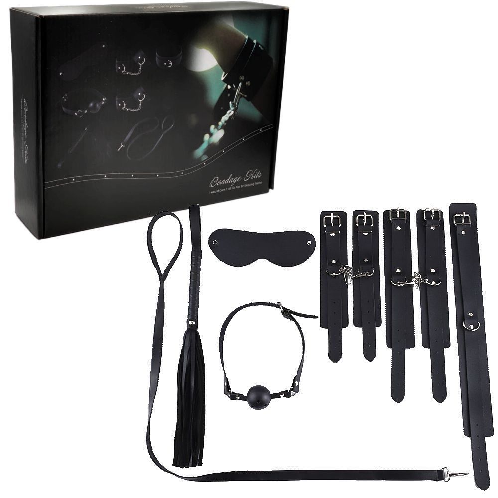 Kit Bondage composto por 7 itens confeccionados em couro sintético e alguns com metal, ideal para você que ama uma prática sadista mais confortável. Composta por par de algemas, par de tornozeleiras, guia, coleira, chicote, corda e mordaça com bola. Alguns itens possuem ajuste de circunferência. Ideal para noites mais intensas e sadistas!