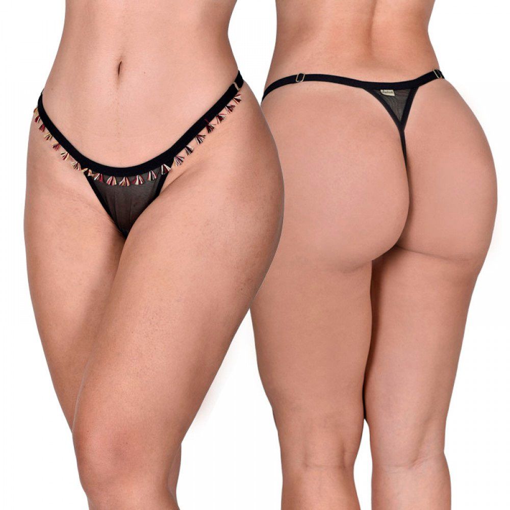 Calcinha Mentirinha - Calcinha fio dental Sexy em tule. Cintura com regulagem. Peça com transparência devido ao tipo de tecido. Detalhe com franjas pequenas coloridas na frente!