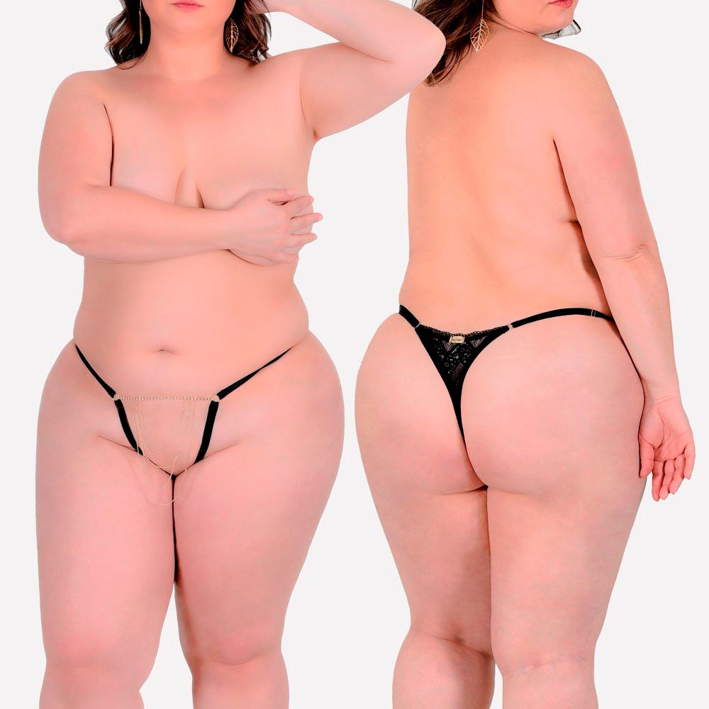 Calcinha Serelepe – Calcinha fio dental sexy em renda com abertura na parte inferior e na frente. Tamanho plus size e frente toda em biju trazendo mais luxo para o look. Cintura regulável.