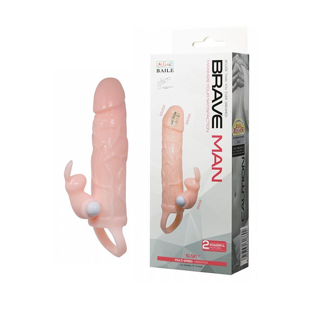 Capa peniana extensora Brave Man, em forma de pênis com glande, preenchimento na ponta, prepúcio definido, veias salientes e confeccionado em TPR. Possui anel para o escroto que auxilia a retardar a ejaculação e assegurar que a capa não escapará durante o uso. O estimulador de clítoris tem forma de coelho acoplada à uma cápsula vibratória acionada por um botão lateral. A extremidade da capa também possui um motor de vibração única que é ativado assim que a glande pressiona levemente o mesmo. Experimente o melhor para a sua noite mais desejada!
