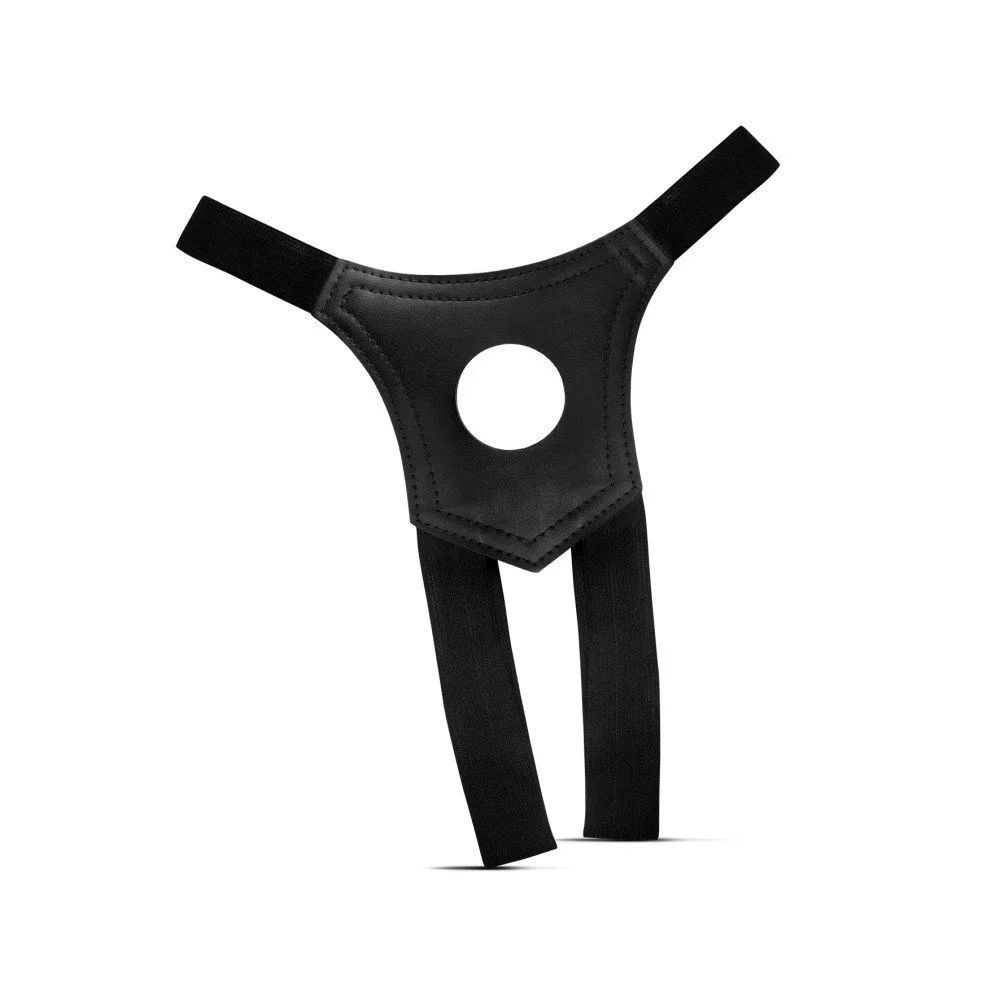 Cinto em couro sintético com elásticos fixos, para utilização com pênis realístico.