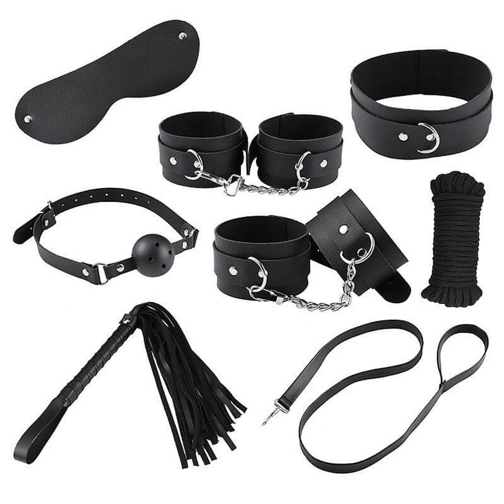 Kit Bondage composto por 7 itens confeccionados em couro sintético e alguns com metal, ideal para você que ama uma prática sadista mais confortável. Composta por par de algemas, par de tornozeleiras, guia, coleira, chicote, corda e mordaça com bola. Alguns itens possuem ajuste de circunferência. Ideal para noites mais intensas e sadistas!