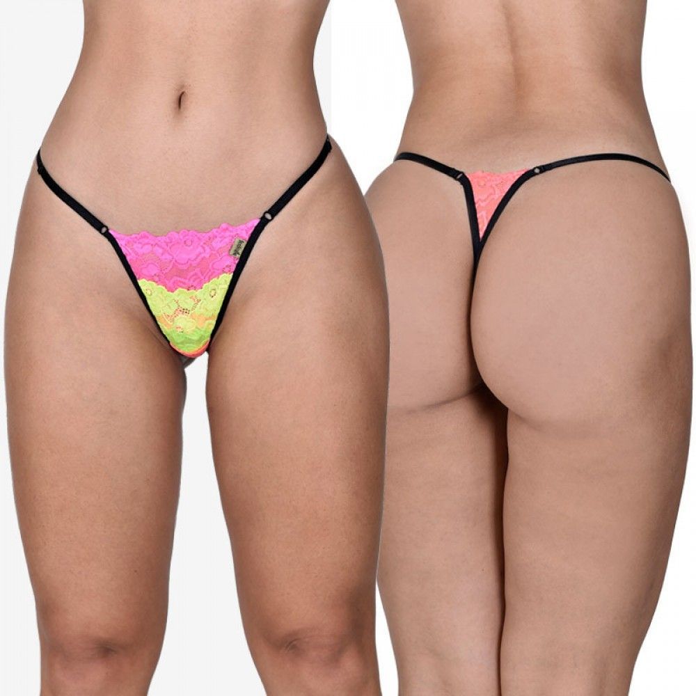 Calcinha Trinca - Calcinha fio dental em renda neon colorida. Cintura com regulagem proporcionando um melhor ajuste em vários tipos de quadris.