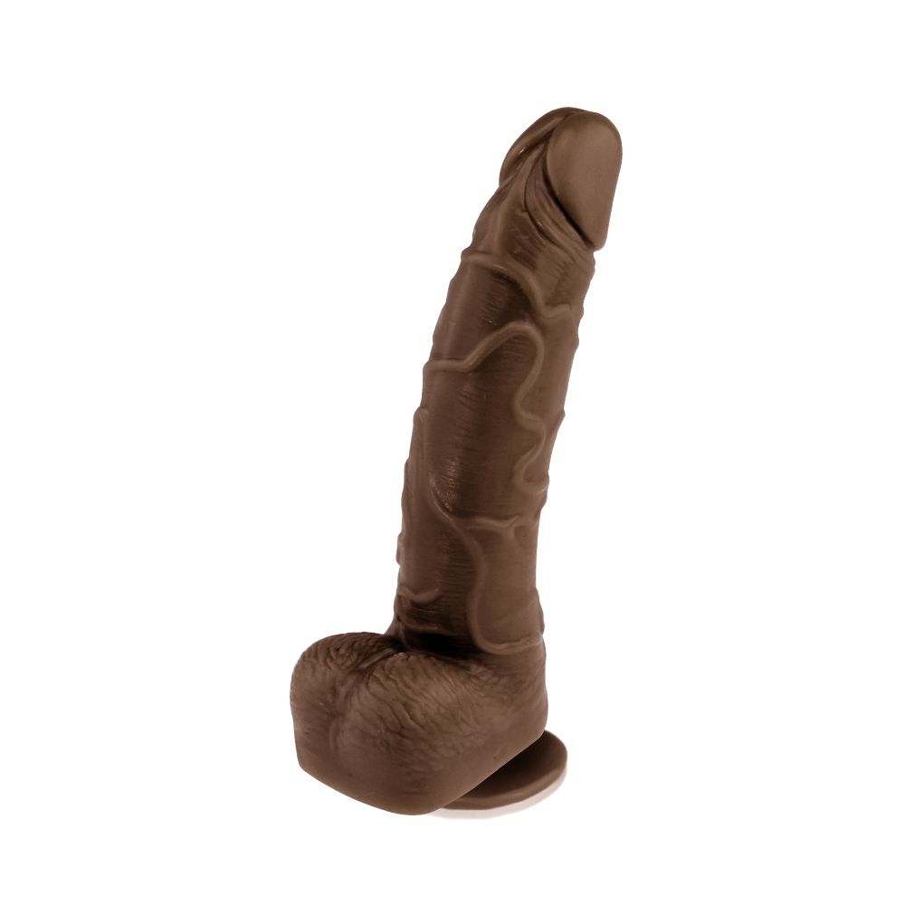 Pênis de Borracha Realístico Em Formato Curvo Com Glande Definida, Veias Suave, Escroto e Ventosa 13 X 3,5 CM - Cor: Chocolate