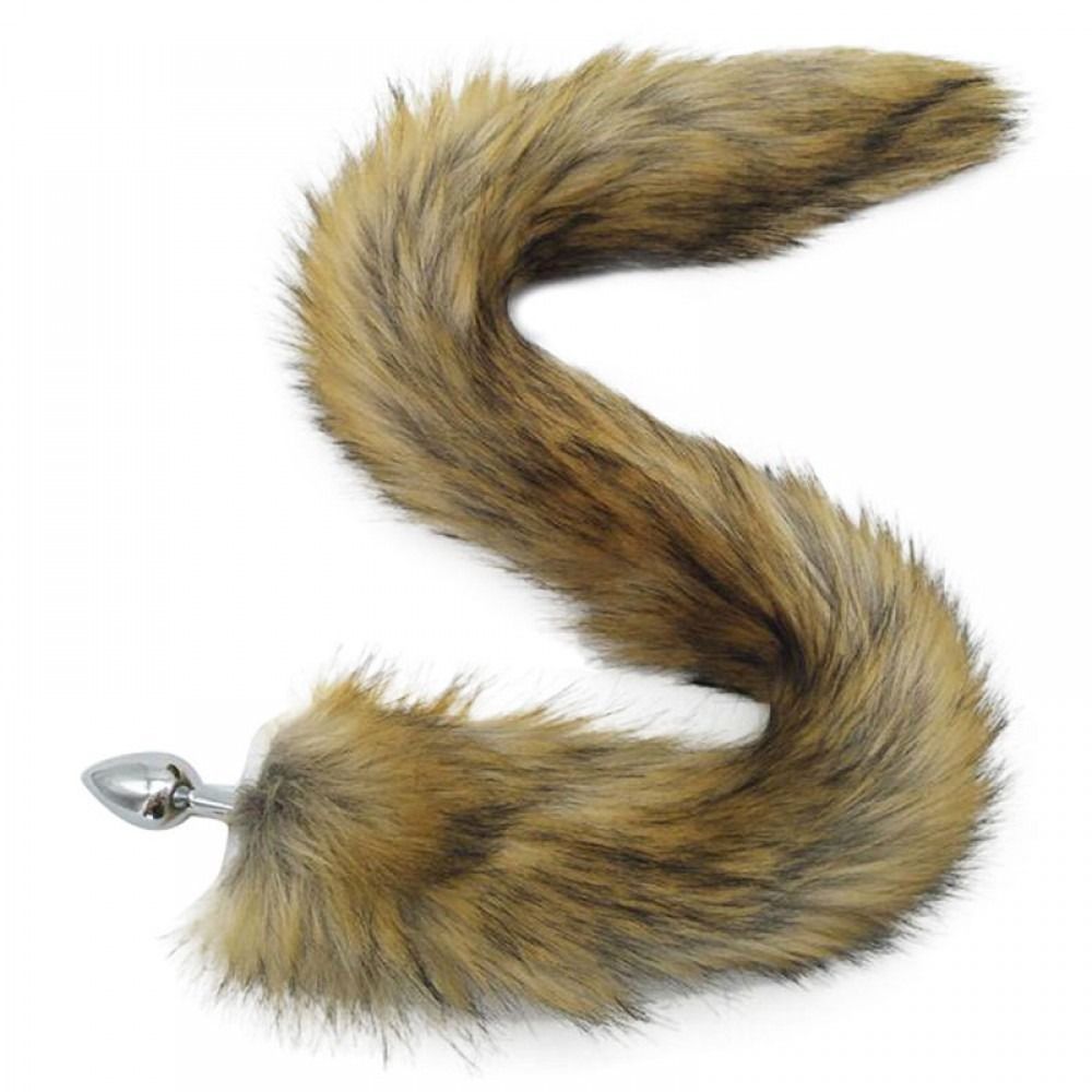 Plug anal em metal, com cauda longa de rapoza na cor marrom, feito em alumínio fundido e polido a mão. e textura da calda realística