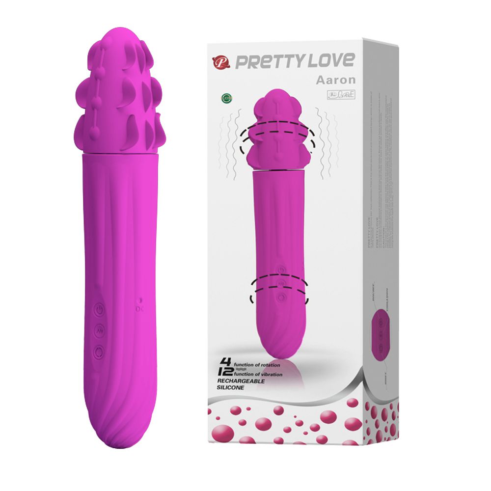 Vibrador Com Dupla Rotação - PRETTY LOVE AARON é recarregável rotativo fabricado em silicone macio e suave ao toque, que rotaciona em suas duas extremidades. Apresenta uma série de relevos ondulados ao longo dele que tornam a penetração mais intensa e prazerosa, possui 4 funções de rotação em suas pontas e textura em alto relevo em uma das extremidades, provocando sensações inigualáveis. Possui ainda, 12 modos de vibração, é ultra silencioso e resistente à água. A rotação e a vibração são controladas separadamente através do painel de controle no próprio vibrador.
