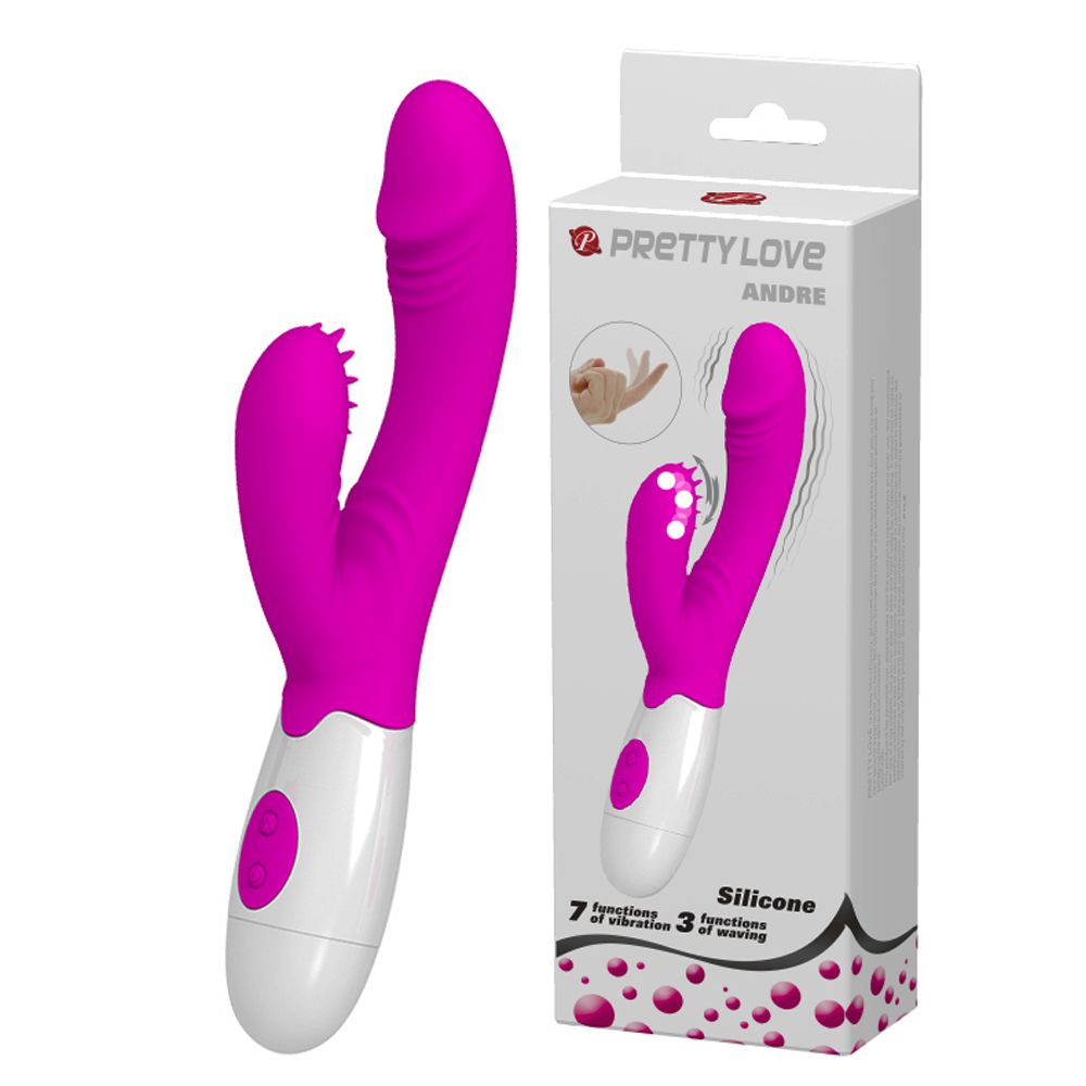 Pretty Love Andre - Vibrador para ponto G com estimulador clitoriano, confecionado em silicone ultra macio à prova d'água. Possui 7 tipos de vibração que irão garantir estímulos intensos e inesquecíveis. A parte que estimula o ponto G, possui formato de glande e produz vibrações muito intensas, estimulando com perfeição. O plug lateral possui uma série de relevos massageadores e uma bolinha interna que se movimenta para cima e para baixo, o que torna os estímulos ao clitóris ainda mais prazerosos!