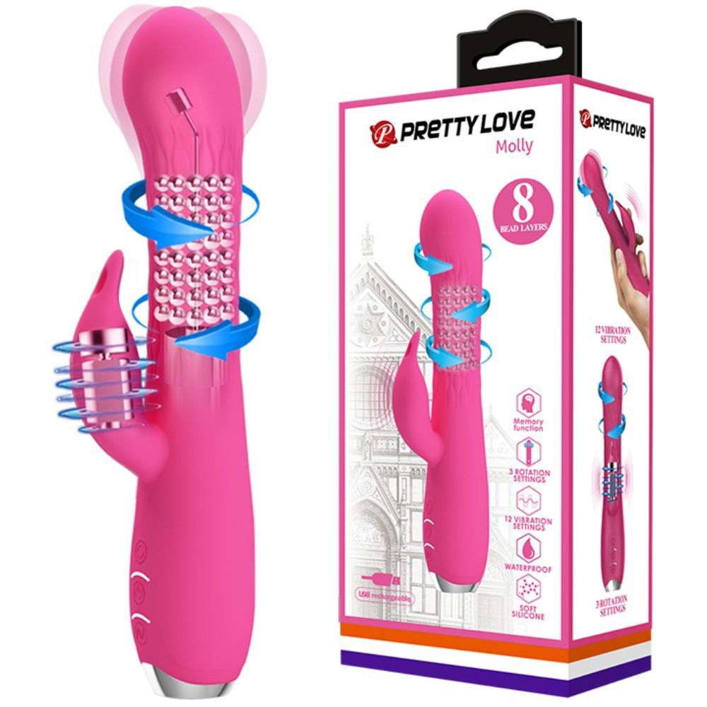 Molly é o novo estimulador de ponto G e clitóris da Pretty Love que chegou para levar você à loucura. Todo confeccionado em silicone de toque macio e aveludado, o vibrador de ponto G possui pérolas metálicas internas para a estimulação ficar mais prazerosa e 3 velocidades de rotação e o estimulador de clitóris vem com 12 modos de vibração. As duas funções podem ser acionadas juntas ou separadamente, tudo regulado por botões na base do vibrador. Ele ainda é recarregável via cabo e resistente à água. Estimule as regiões de maior prazer do seu corpo, permita-se ter grandes orgasmos sem precisar de muito esforço!