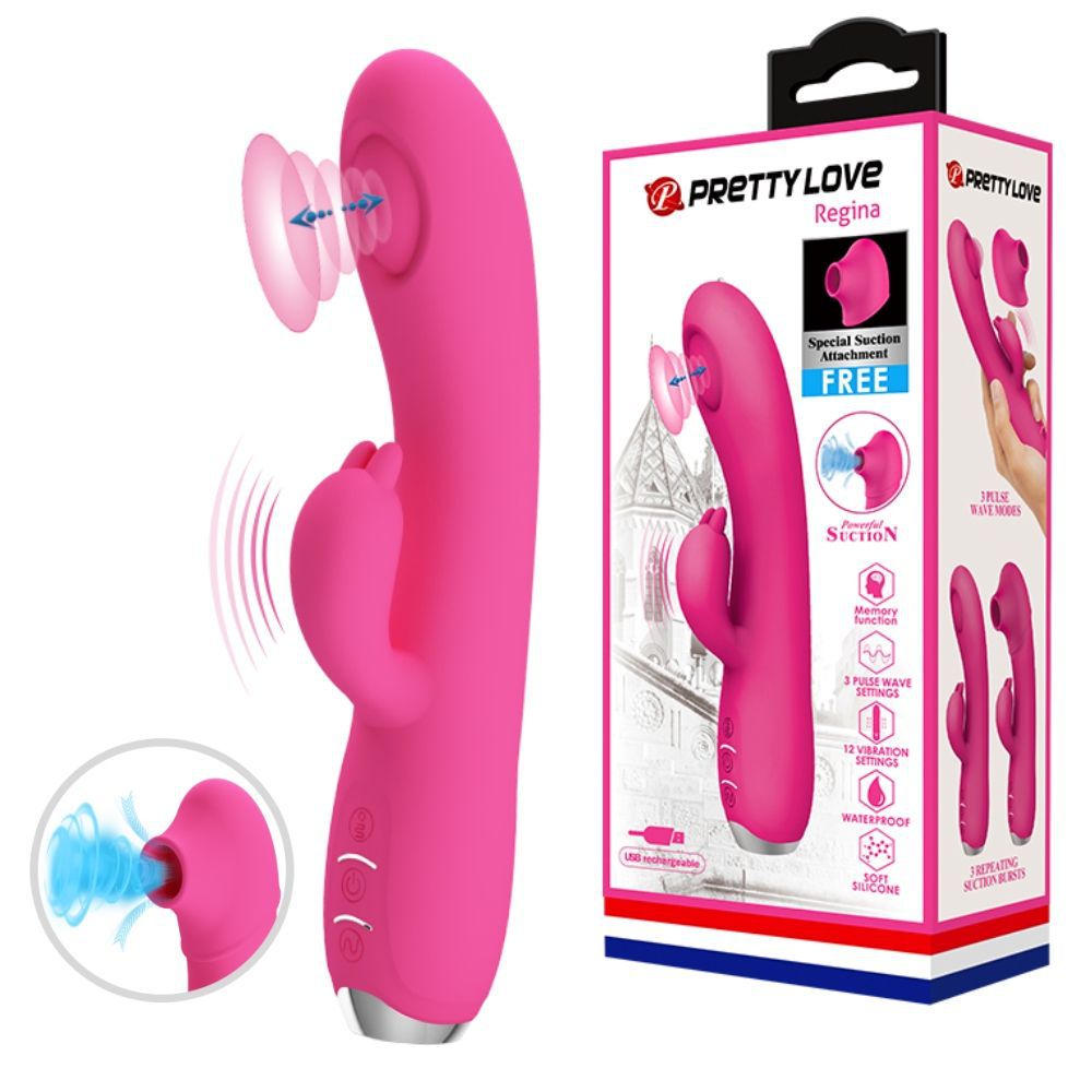 A Pretty Love é uma marca brinquedos eróticos que apimenta as estimulações, e apresenta o Regina, que é um estimulador com sucção todo confeccionado em silicone soft touch com toque aveludado. O estimulador de clítoris possui 12 modos de vibração e orelhinhas. Já a parte maior, pode ser usada tanto como estimulador de ponto G ou como um sugador clitoriano com 3 intensidades de sucção (feita através de pulsações) e capinha removível. Ele é resistente à água e recarregável via cabo USB. Este produto se tornará seu melhor amigo depois de você ter seu primeiro orgasmo ainda mais intenso, duradouro e prazeroso!