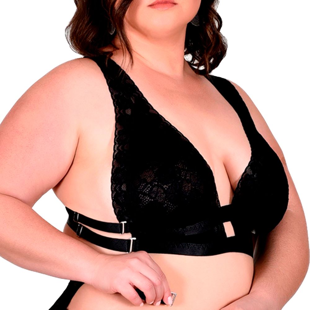 Sutiã Aconchego – Sutiã em renda com forro em tule, sem bojo e com alças largas. Detalhe em strappy ou tiras no tronco com regulagem e gancho, possibilitando abertura. Super sexy e confortável.