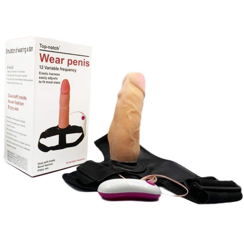 Cinta peniana regulável em elastano com fivelas e prótese em formato de pênis em Cyberskin com glande definida, colo (a cavidade definida logo abaixo à glande) possui 12 modos de vibrações , textura suave de veias.