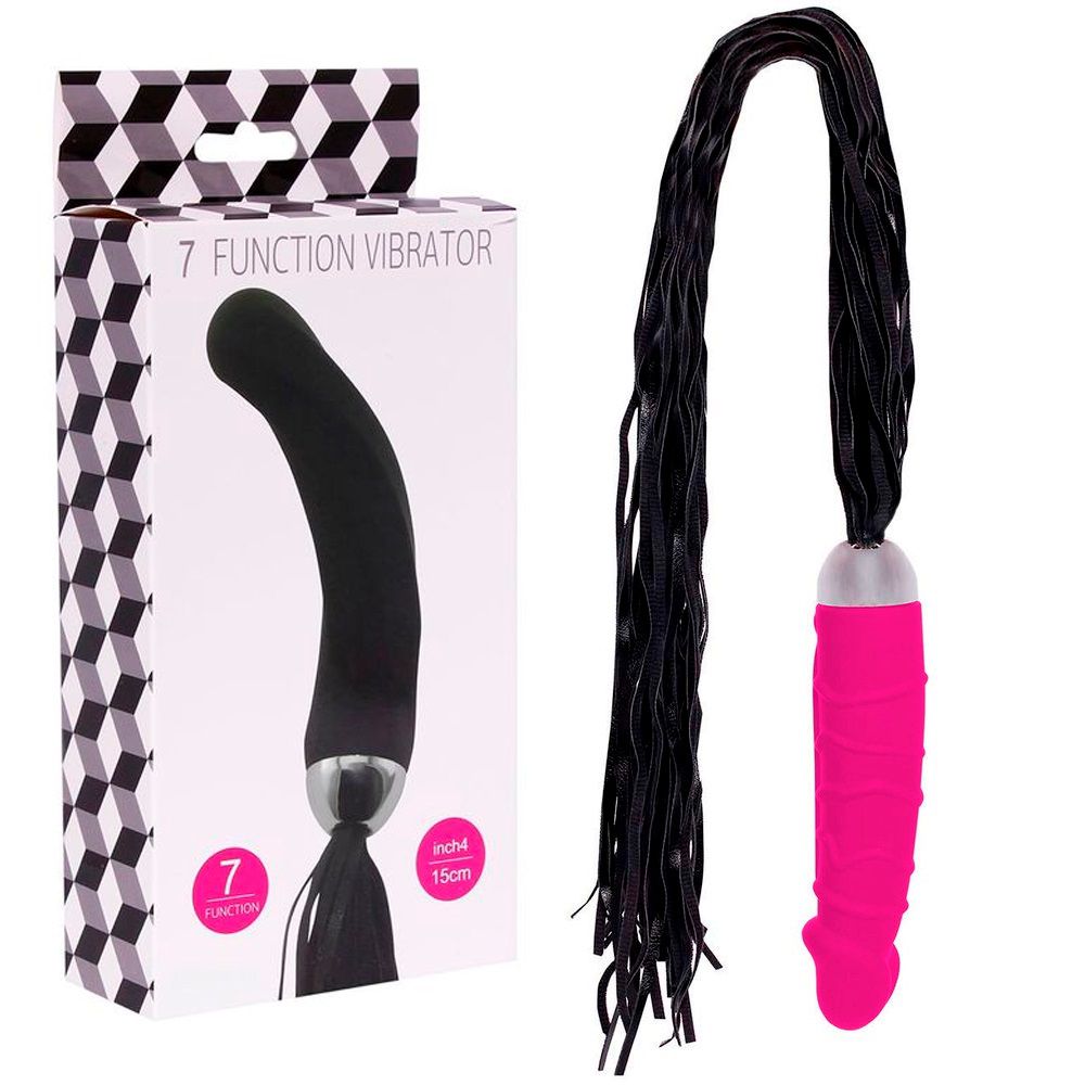 Vibrador Formato de Pênis com Glande Saliente e Chicote em Couro Sintético - É um produto feito em silicone com toque aveludado e tiras de couro sintetico, possui 7 modos de vibração podendo ser usado de 3 modos:
