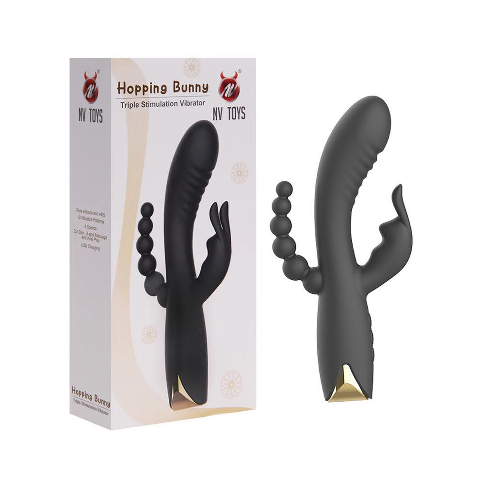 Vibrador com tripla estimulação Hopping Bunny, o queridinho que irá inovar o prazer da mulher!!! Vibrador ponto g, estimulador de clitóris e anal feito em silicone, material macio de toque agradável e fácil limpeza, possui 10 modos de vibração e 4 níveis de intensidade incriveís, sendo recarregável!! O Produto é ergonômico, o que facilita o manuseio e a estimulação, trazendo uma sensação prazerosa do uso.