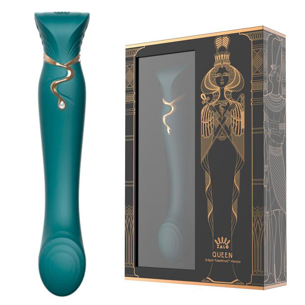 Vibrador Ponto G - Zalo Queen PulseWave é recarregável que ganhou o prêmio de melhor produto do ano de 2018 por conter a exclusiva tecnologia PulseWave. Todo desenvolvido em silicone de grau alimentício, com esse grau de segurança significa que ele segue as regras Dow Corning, com os requisistos da FDA na qual exige uma série de padrões que não trará malefícios ao corpo. Ele possui toque macio, suave e aveludado que assemelha-se à pele de um bebê e exclusivo revestimento exterior em Softek ™. Com detalhes inspirados na Rainha Cleópatra do antigo Egito feito com muita vaidade, particularidades finas e requintadas e pedra de Swarovski que traz um tom mais elegante para o vibrador.