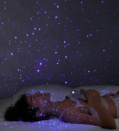 A base de carregamento possui projetor de luzes estelares com 3 modos de iluminação em tons roxos, criando um clima envolvente e sensual.